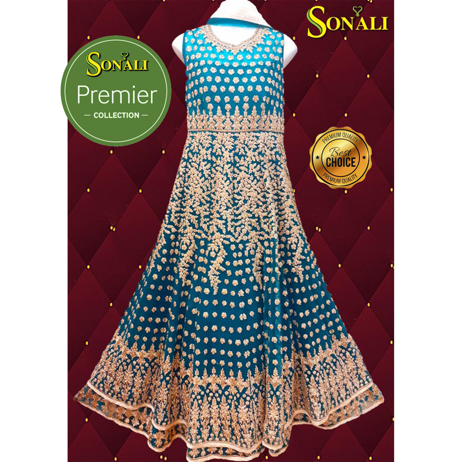 Sonali Premier Quality Women’s Wedding Dinner / Heavy Work Embroidered Work / High Quality Material / Sky Blue Long Gown + Dupatta - LSK02 - FS